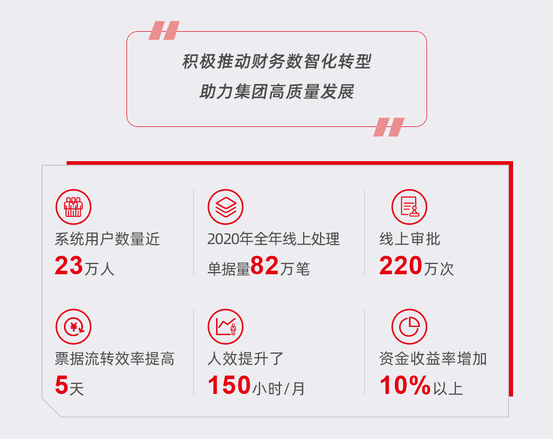 财务共享平台的应用促进了鞍钢集团财务体系结构由核算与管理二级职能机构转型为战略财务、共享财务、业务财务三位一体的财务组织结构; 系统用户数量近23万人,2020年全年线上处理单据量82万笔,线上审批220万次,助力集团提高会计核算工作效率、提高集团控制效率; 通过票据信息集中管理与付款信息集中配票,票据流转效率提高5天,人效提升了150小时/月; 通过统一理财业务,调整理财结构,资金收益率增加10%以上。