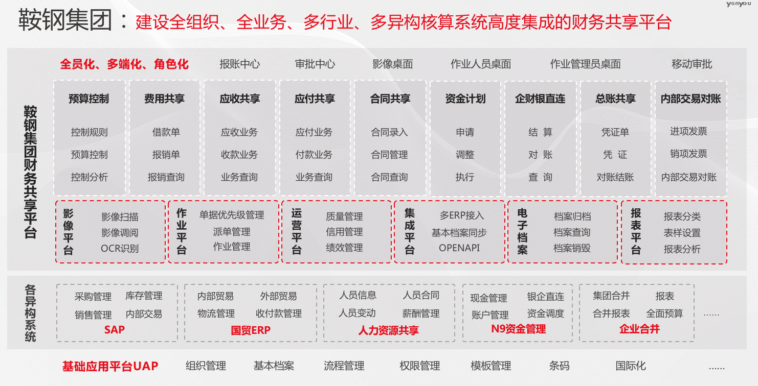 基于用友UAP平台建设了全组织、全业务、多行业、多异构核算系统高度集成的财务共享平台,包括报账中心、审批中心、影像桌面、作业人员桌面、作业管理员桌面、移动审批等模块,涵盖预算控制、费用共享、应收共享、应付共享、合同共享、资金计划、企财银直连、总账共享、内部交易对账等功能。