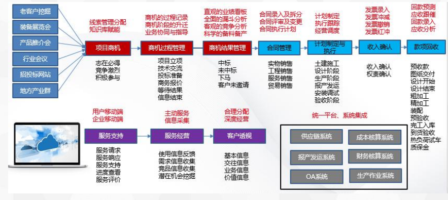 售前阶段建立以商机为核心的高效赢单体系,助力一重高效赢单;售中阶段需建立以合同为核心的进度跟踪、收入确认、款项回收体系,助力一重实现合同的全程跟踪,确保收入的快速确认;售后阶段需建立以产品使用者为中心的服务支持及服务经营体系,助力一重优化服务、收集产品改进需求、提升产品的品质。
