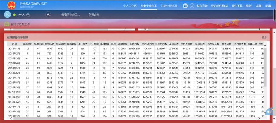 电子政务网运维指标数据包括两个方面的应用:一是具体反馈省直各部门、九个市(州)及贵安新区在电子政务网建设以来的应用情况,二是主要反馈各市州电子政务网服务站点的运维情况,按月统计反馈。
